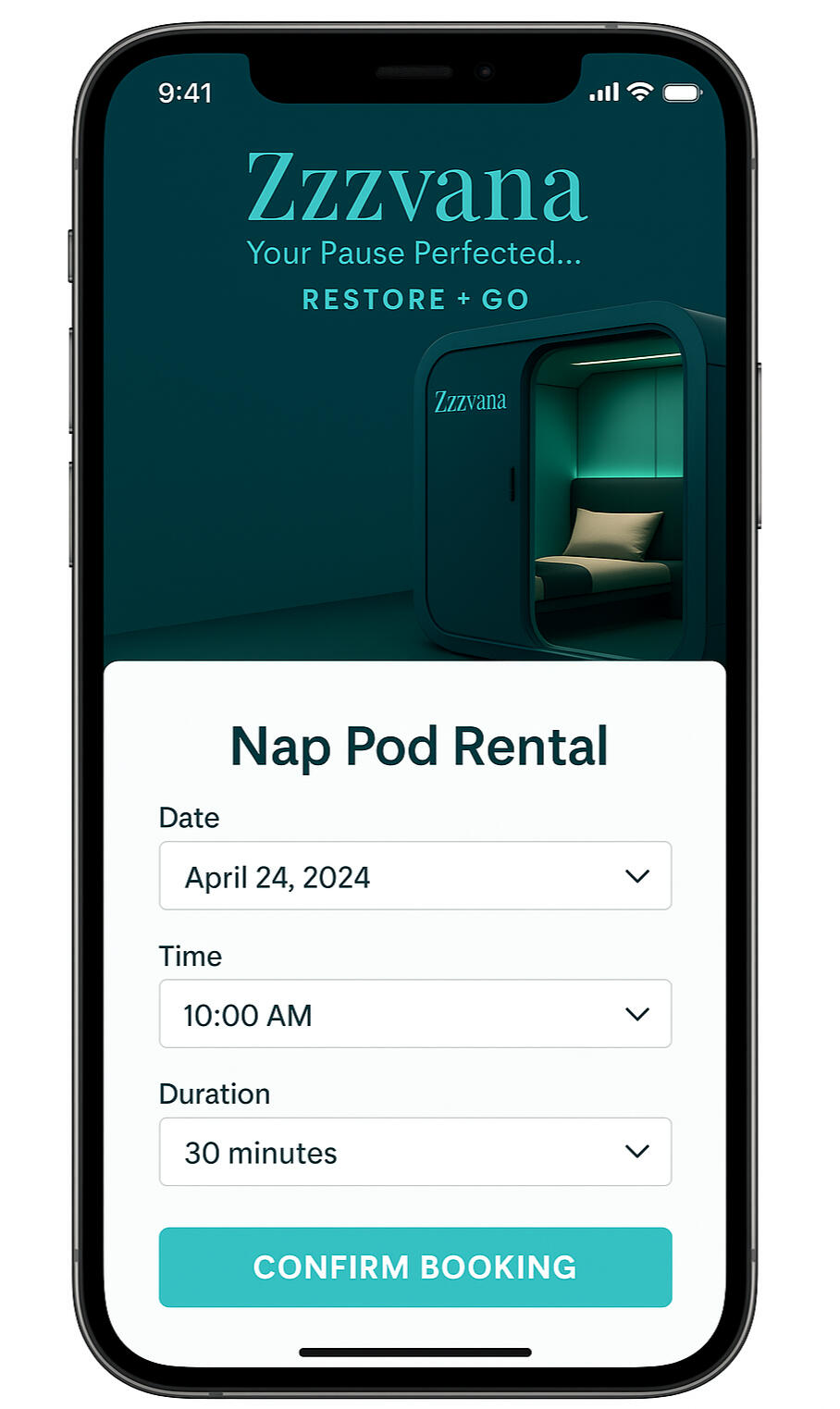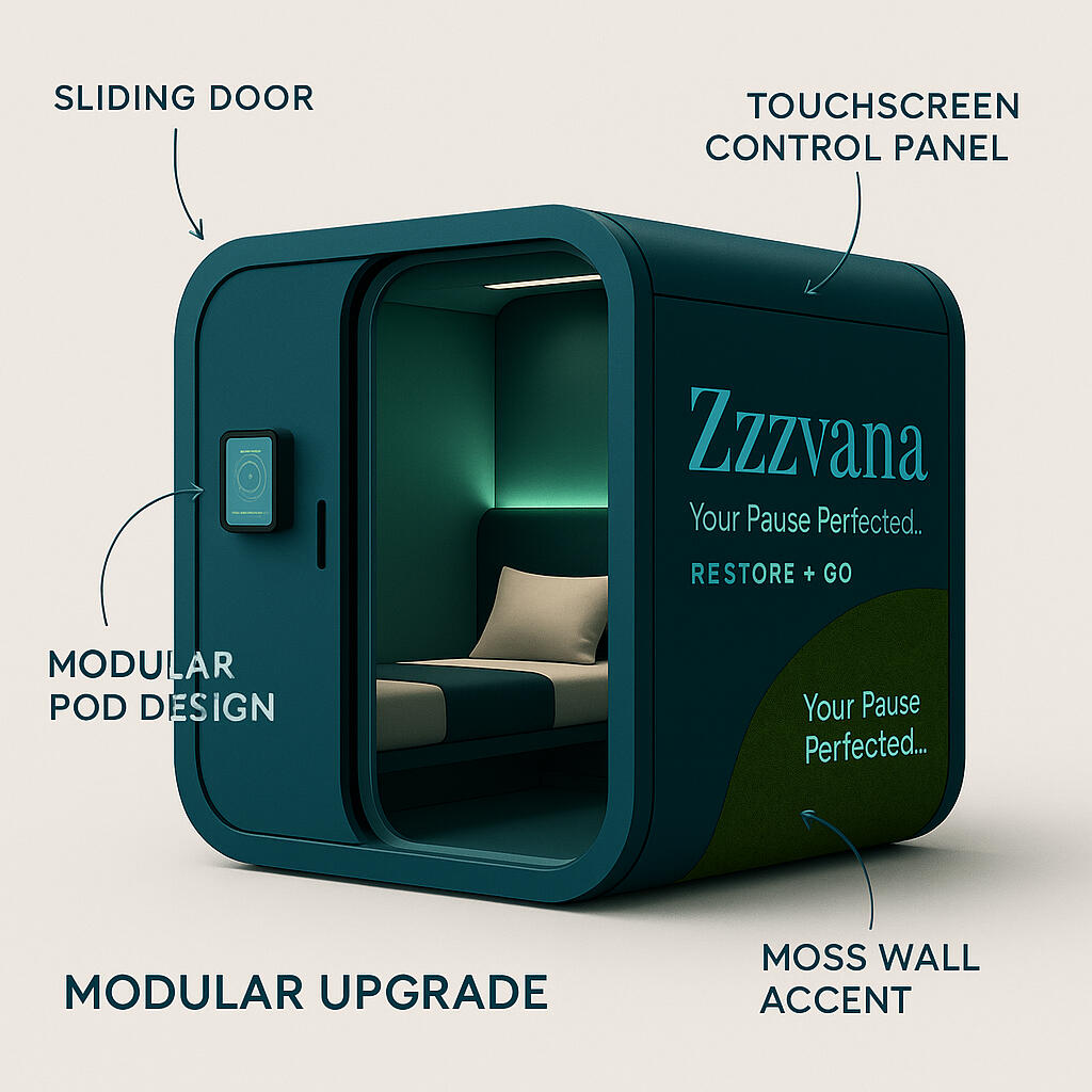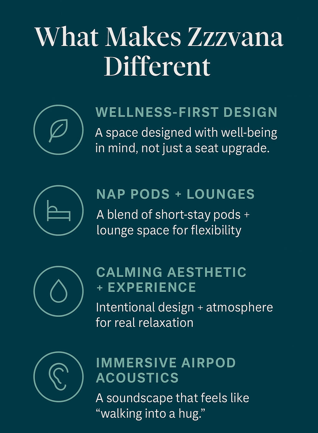 Zzzvana reimagines rest in transit with private nap pods + wellness forward spaces. We're here to make restorative breaks for travelers, accessible + stylish.